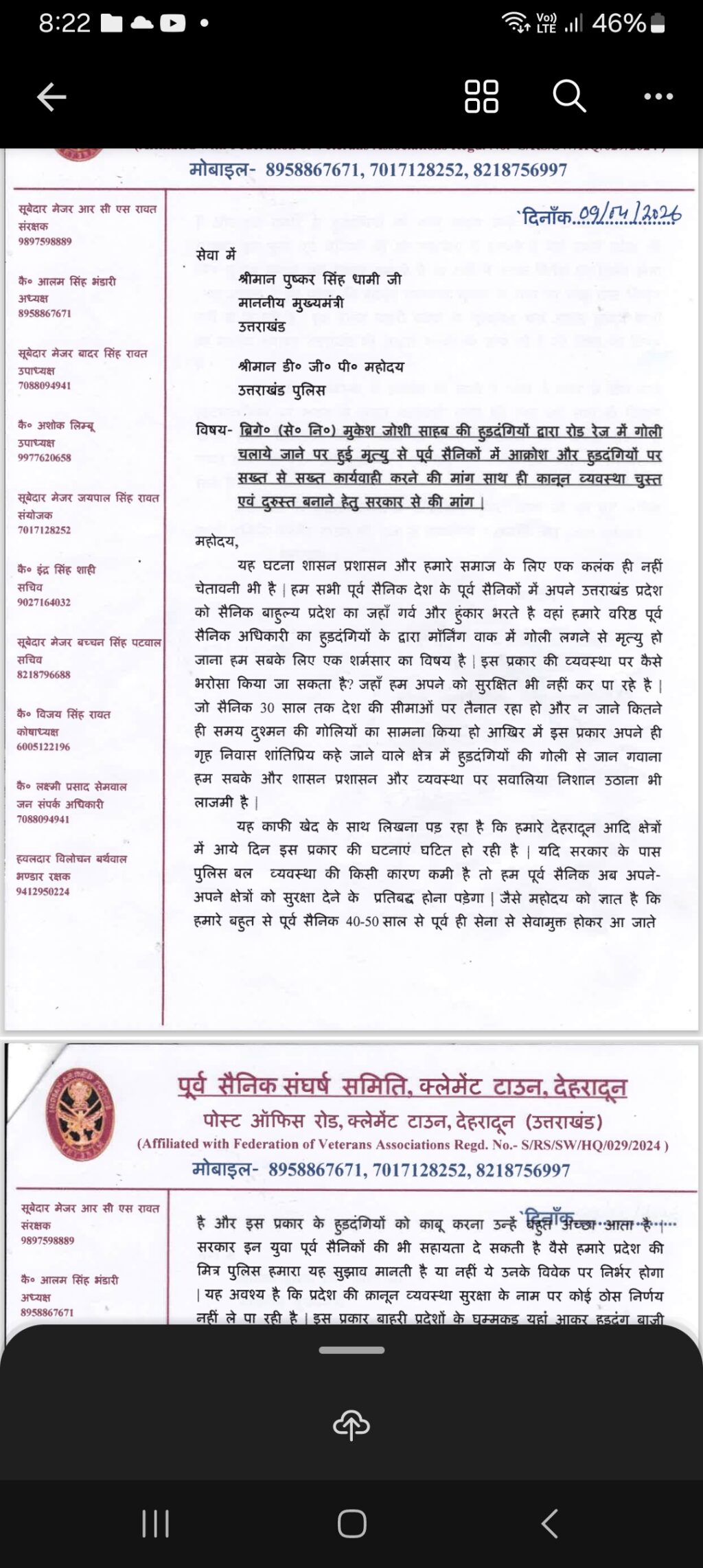 देहरादून में रोड रेज की एक गंभीर घटना में ब्रिगेडियर (सेवानिवृत्त) मुकेश जोशी की गोली लगने से हुई मौत के बाद पूर्व सैनिकों में भारी आक्रोश देखने को मिल रहा है। इस घटना को लेकर पूर्व सैनिकों ने न केवल गहरा शोक व्यक्त किया है, बल्कि प्रदेश की कानून व्यवस्था पर भी गंभीर सवाल खड़े किए हैं।