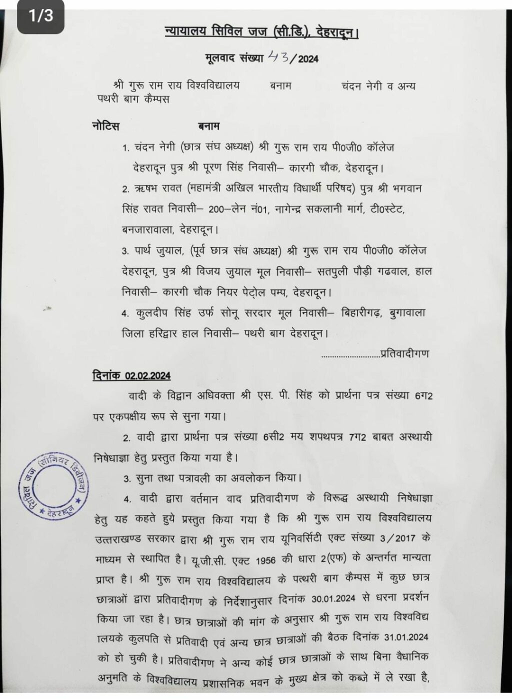 न्यायालय सिविल जज (सी.डि.) ने निषेधाज्ञा आदेश किया पारित विश्वविद्यालय परिसर में नहीं कर सकते धरना प्रदर्शन