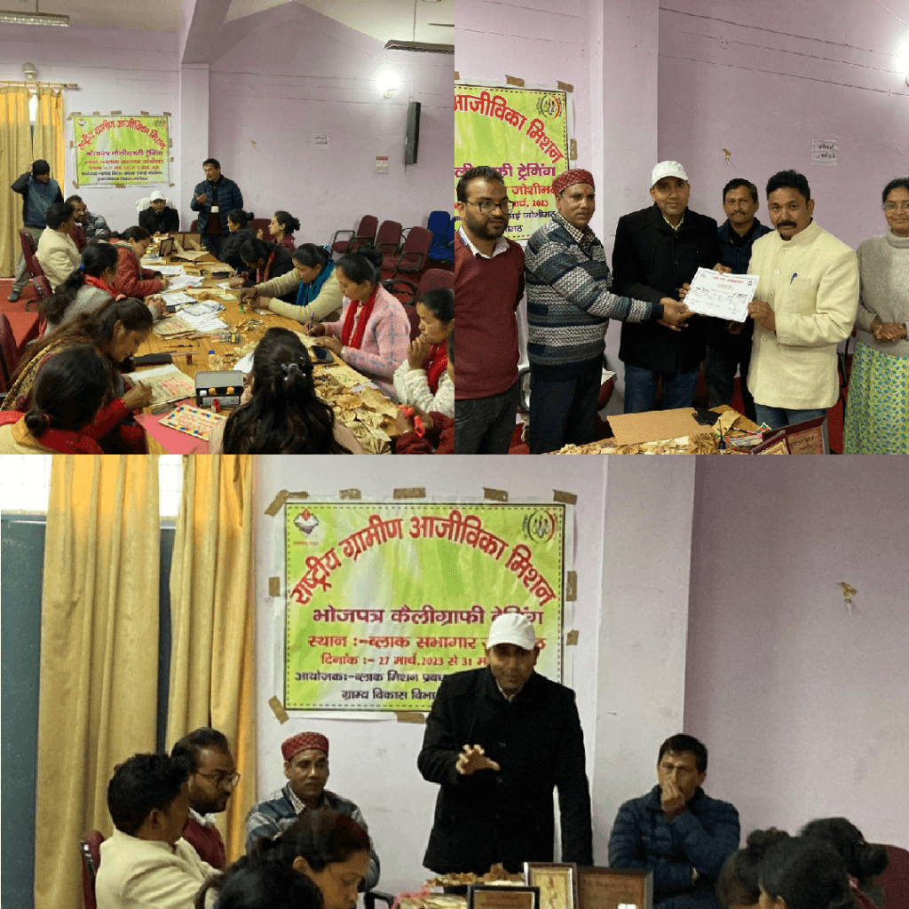 चमोली जोशीमठ व्लाक में राष्ट्रीय ग्रामीण आजीविका मिशन द्वारा आयोजित पांच दिवसीय भोज पत्र कैलीग्राफी प्रशिक्षण कार्यक्रम के तहत प्रधान कागा गरपक जिला महामंत्री प्रधान संध चमोली को मास्टर टैªनर के रूप में नियुक्त किया गया। जिसमें मास्टर टेªनर द्वारा समूह की महिलाओं को पांच दिन में भोज पर बद्रीशधाम की आरती,बद्रीविशाल के स्लोक,भोज पत्र की माला व अन्य कई प्रकार के चित्रण की ट्रेनिंग दी गई।