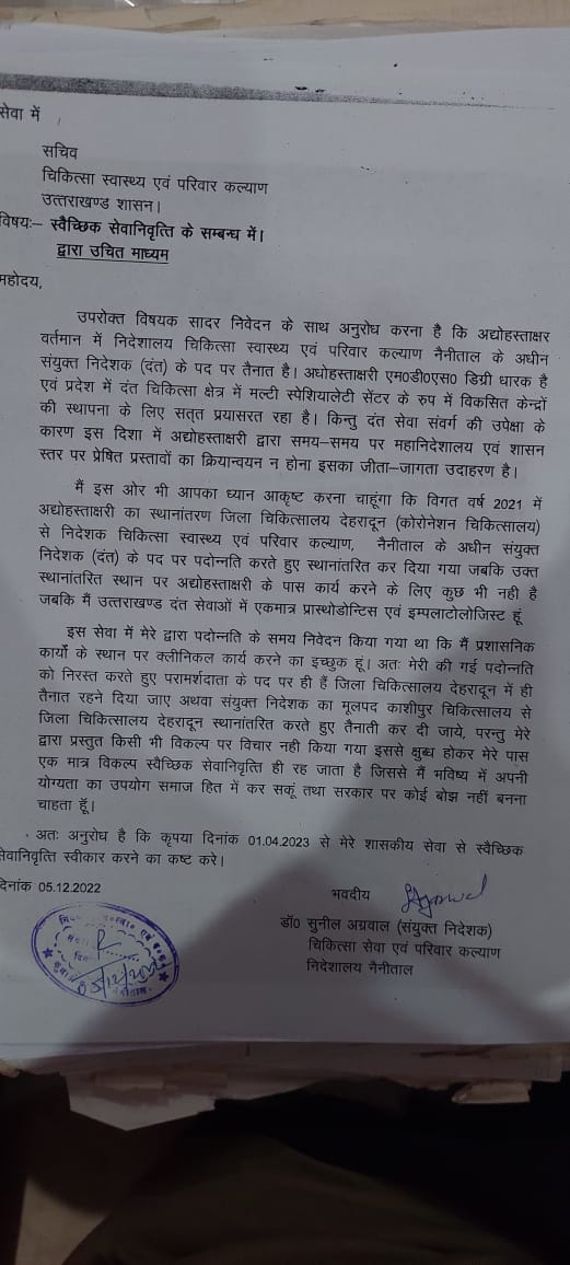डाॅ0 सुनील अग्रवाल निदेशालय स्वास्थ्य, नैनीताल में संयुक्त निदेशक (दंत) के पद पर तैनात थे। उन्होने 31 मार्च 2023 को स्वैच्छिक सेवा निवृत्ति ले ली। डाॅ0 अग्रवाल (एम0डी0एस0) स्वास्थ्य विभाग में एकमात्र क्राउन, ब्रिज, इम्प्लान्ट स्पेशलिस्ट थे। डाॅ0 अग्रवाल द्वारा सरकार से क्लिनिकल कार्य करने की इच्छा व्यक्त की थी, जिससे उनकी स्पेशलिस्ट का जनता को लाभ मिल सके, परन्तु सरकार द्वारा उन्हें जिला अस्पताल कोरोनेशन देहरादून से निदेशालय स्वास्थ्य, नैनीताल में तैनात कर दिया गया, जिससे क्षुब्ध उन्होने सेवा निवृत्ति ले ली, जो कि सरकार की नाकामी है। एक तरफ तो सरकार स्पेशलिस्ट की कमी से जूझ रही है, दूसरी तरफ इस तरह से स्पेशलिस्टों का स्वैच्छिक सेवा निवृत्ति लेने से जनता को नुकसान हो रहा है।