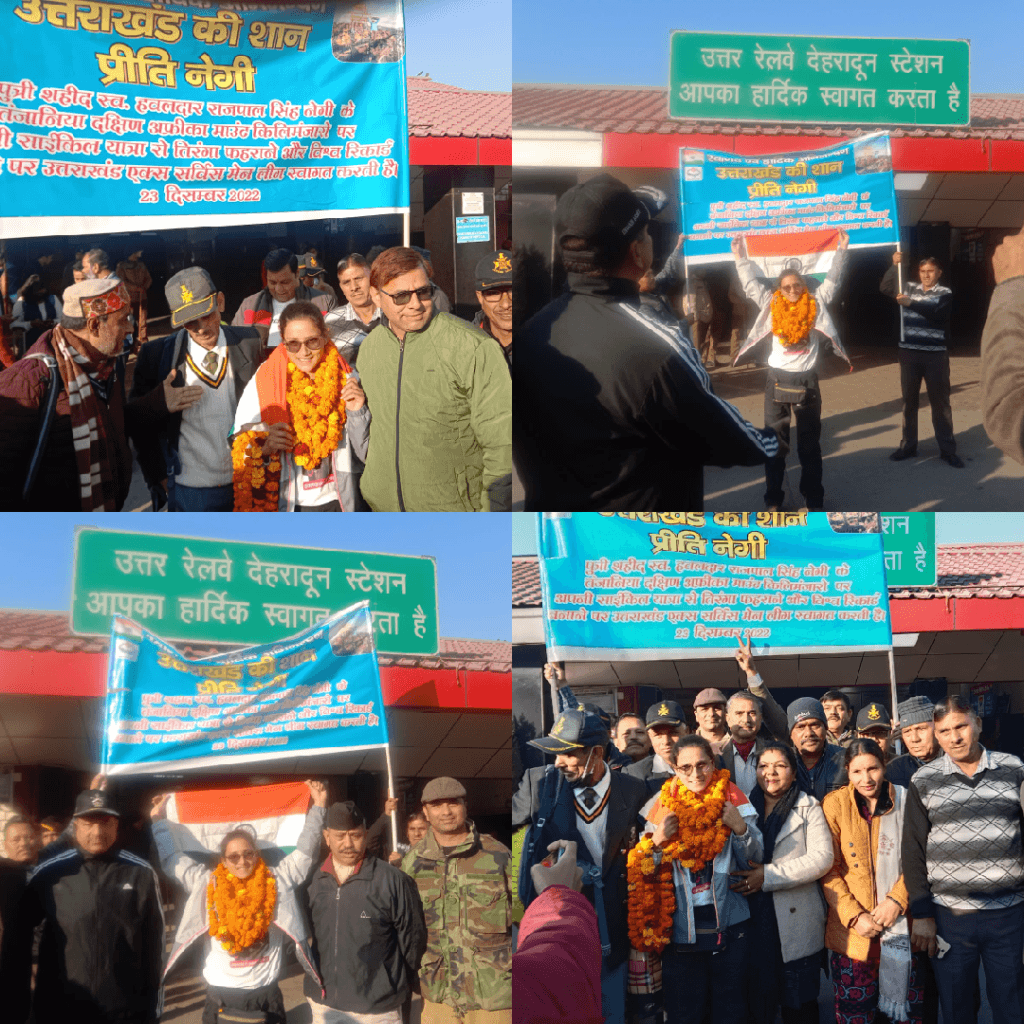 उत्तराखंड की बेटी प्रीति नेगी दक्षिण अफ्रीका में तंजानिया के माउंट किलिमंजारो पर अपनी साईकिल यात्रा करके तिरंगा लहराते हुए और विश्व का कीर्तिमान रिकार्ड बनाकर वापिस देहरादून मसूरी एक्सप्रेस से रेलवे स्टेशन देहरादून पहुंची जहां पर उत्तराखण्ड एक्स सर्विस मेन लीग के पूर्व सैनिकों ने मेजर जनरल (से नि) एम एल असवाल के नेतृत्व में बेटी प्रीति नेगी का भव्य स्वागत किया।